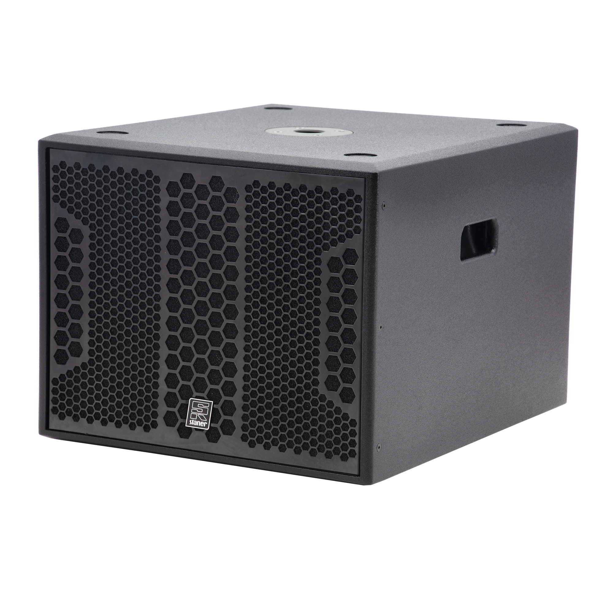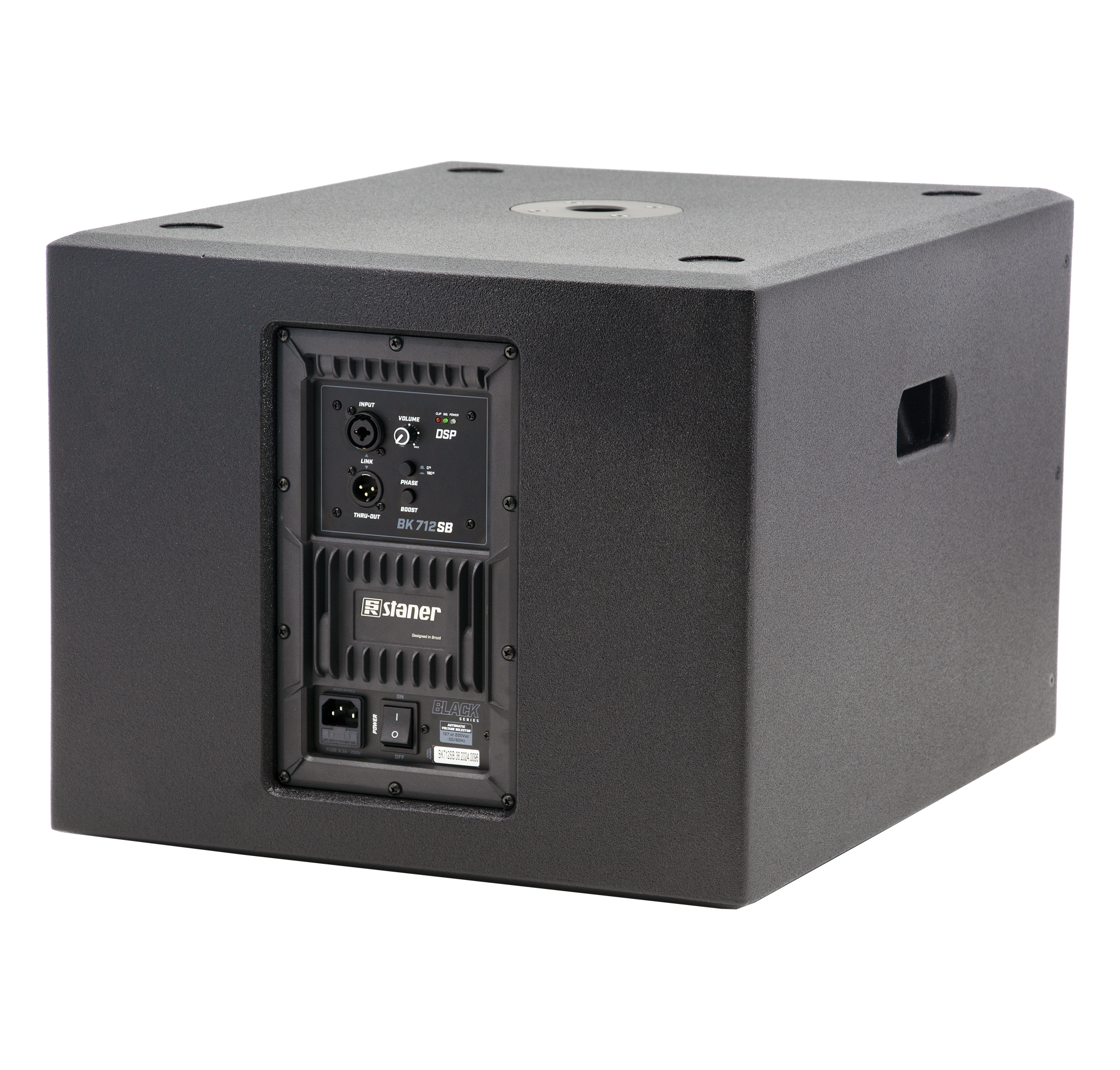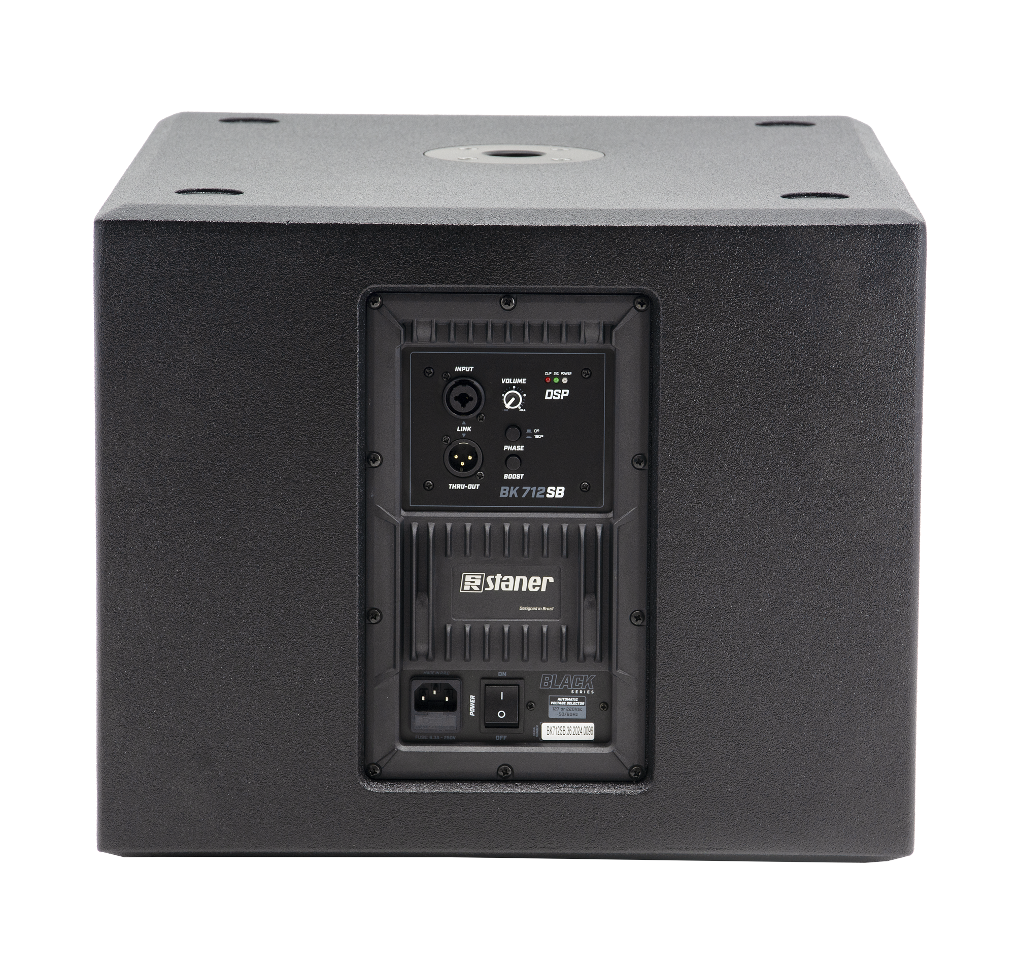 Sub-grave ativo de alto desempenho, gabinete em compensado, acabamento premium, DSP, auto voltagem.